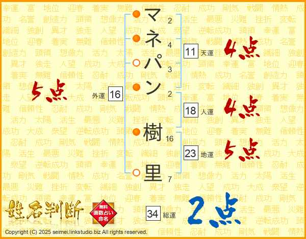 マ(2画)ネ(4画)パ(3画)ン(2画)  樹(16画)里(7画)
