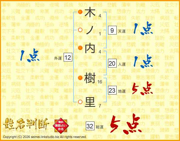 木(4画)ノ(1画)内(4画) 樹(16画)里(7画)