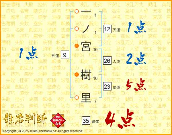 一(1画)ノ(1画)宮(10画) 樹(16画)里(7画)