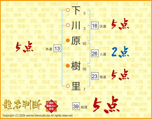 下川原樹里さんの総運は39画の5点!