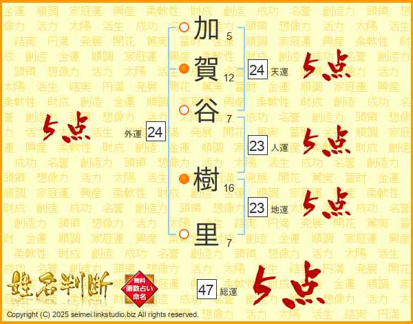 加(5画)賀(12画)谷(7画) 樹(16画)里(7画)
