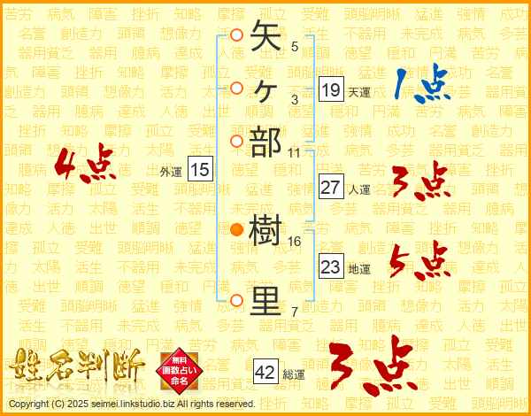 矢(5画)ヶ(3画)部(11画) 樹(16画)里(7画)
