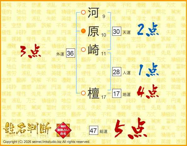 河原崎檀さんの総運は47画の5点!
