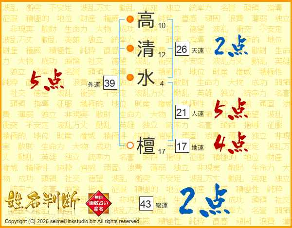 あなたの人生を表す1番重要な運勢です。生涯を通じて影響する総合運となり、主に50歳以降の晩年期に影響を及ぼします。苗字と名前の合計画数。