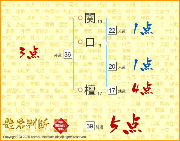 生活面を象徴する運勢です。外部から受ける影響力を表し、結婚運、家庭運や職場、環境への順応性を表します。総運から人運を引いた画数。姓や名が1文字の場合を除く。