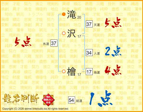 あなたの人生を表す1番重要な運勢です。生涯を通じて影響する総合運となり、主に50歳以降の晩年期に影響を及ぼします。苗字と名前の合計画数。