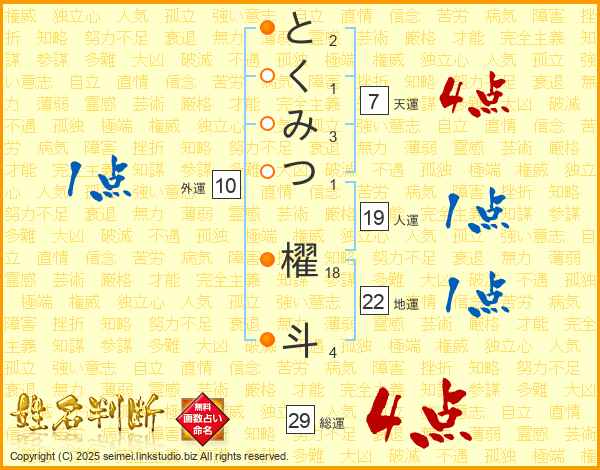 生活面を象徴する運勢です。外部から受ける影響力を表し、結婚運、家庭運や職場、環境への順応性を表します。総運から人運を引いた画数。姓や名が1文字の場合を除く。