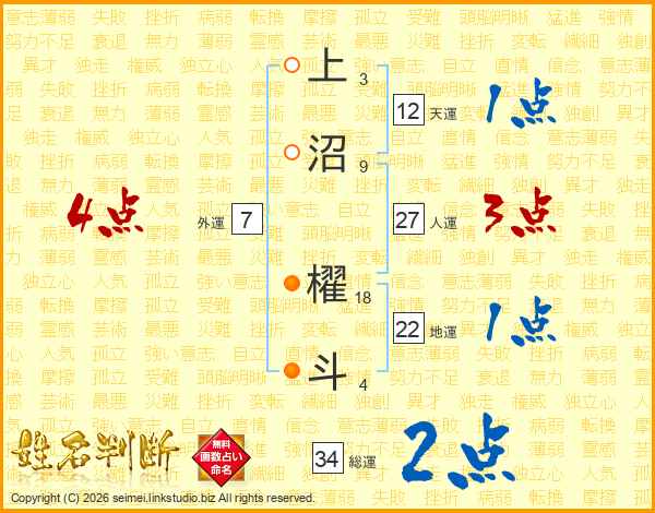 上沼櫂斗さんの総運は34画の2点!