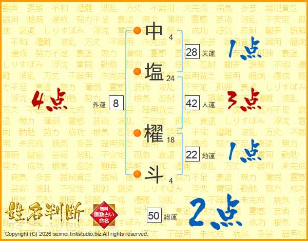 中(4画)塩(24画) 櫂(18画)斗(4画)