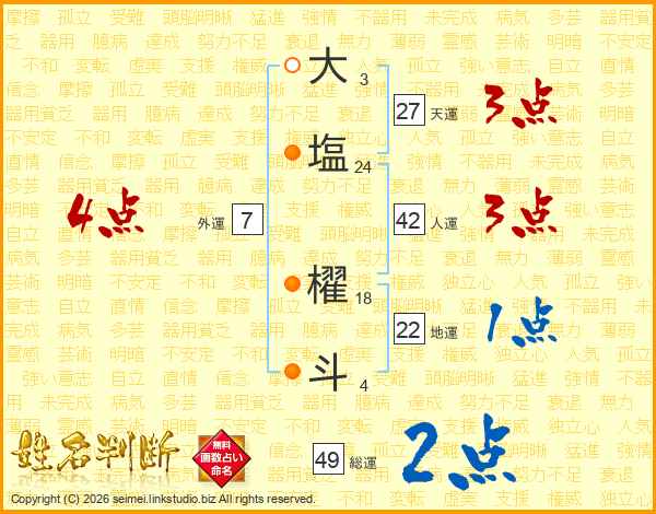 大(3画)塩(24画) 櫂(18画)斗(4画)