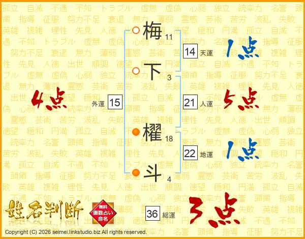 梅(11画)下(3画) 櫂(18画)斗(4画)