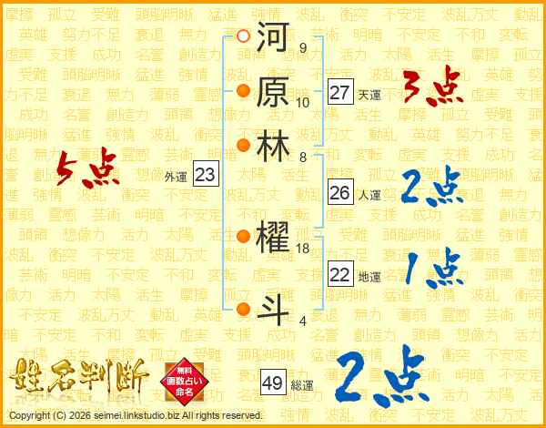 河(9画)原(10画)林(8画) 櫂(18画)斗(4画)