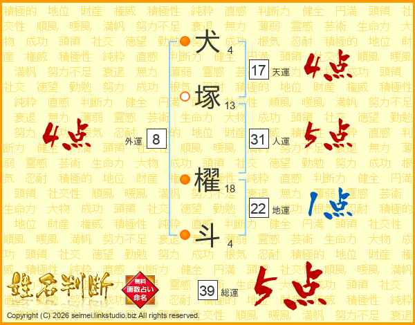 犬塚櫂斗さんの総運は39画の5点!