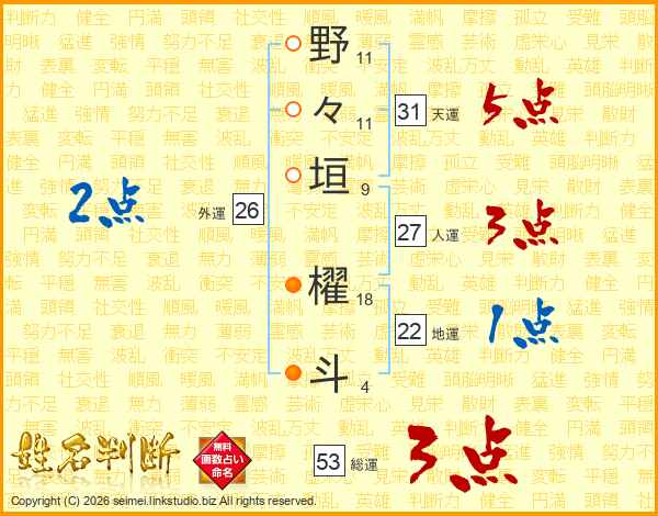 野々垣櫂斗さんの天運は31画の5点!