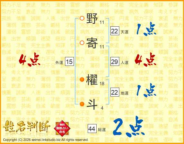 野(11画)寄(11画) 櫂(18画)斗(4画)
