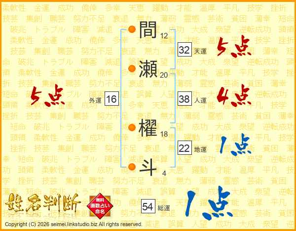 間(12画)瀬(20画) 櫂(18画)斗(4画)