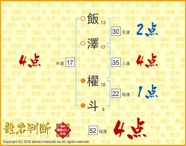 飯澤櫂斗さんの総運は52画の4点!