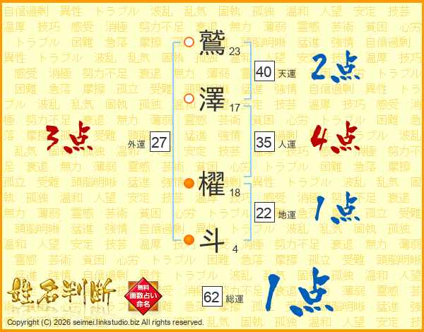 鷲(23画)澤(17画) 櫂(18画)斗(4画)