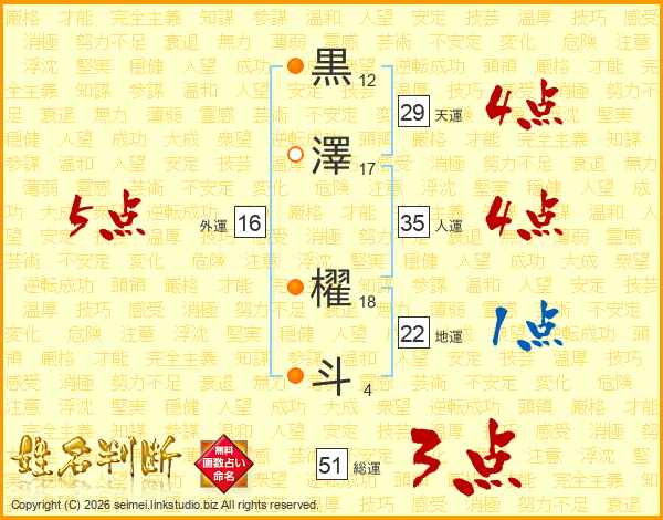 黒澤櫂斗さんの総運は51画の3点!