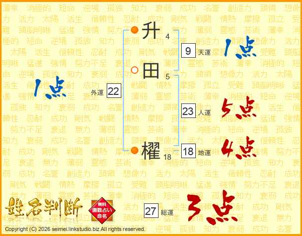 生活面を象徴する運勢です。外部から受ける影響力を表し、結婚運、家庭運や職場、環境への順応性を表します。総運から人運を引いた画数。姓や名が1文字の場合を除く。