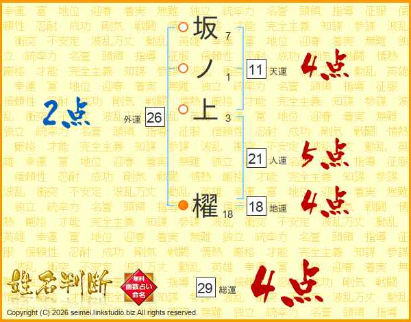 坂ノ上櫂さんの総運は29画の4点!