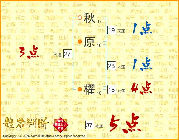 あなたの人生を表す1番重要な運勢です。生涯を通じて影響する総合運となり、主に50歳以降の晩年期に影響を及ぼします。苗字と名前の合計画数。