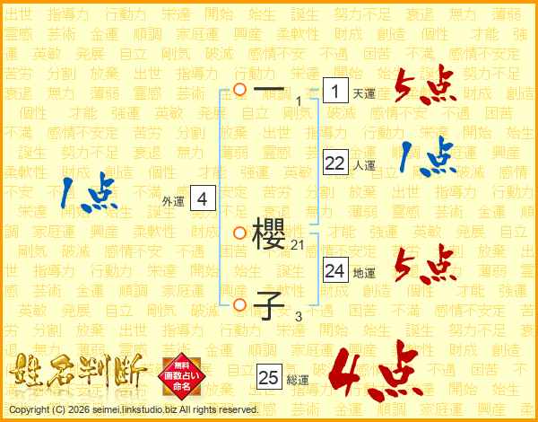 あなたの人生を表す1番重要な運勢です。生涯を通じて影響する総合運となり、主に50歳以降の晩年期に影響を及ぼします。苗字と名前の合計画数。