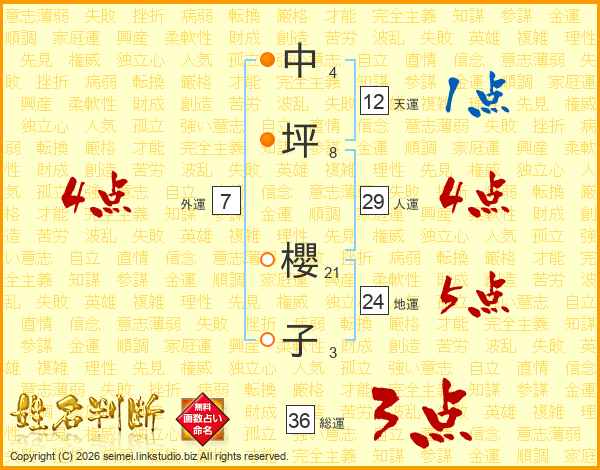 中(4画)坪(8画) 櫻(21画)子(3画)