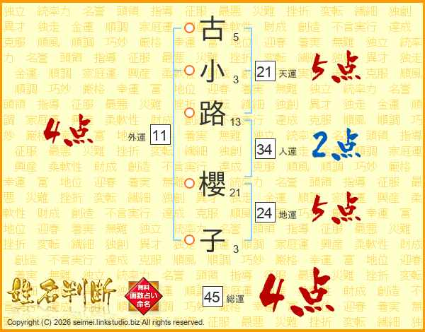 古(5画)小(3画)路(13画) 櫻(21画)子(3画)
