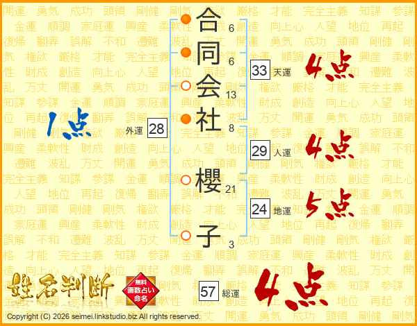 合(6画)同(6画)会(13画)社(8画) 櫻(21画)子(3画)