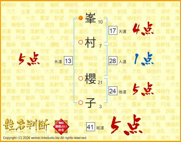 峯(10画)村(7画) 櫻(21画)子(3画)