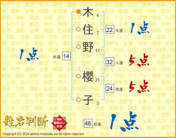 木(4画)住(7画)野(11画) 櫻(21画)子(3画)