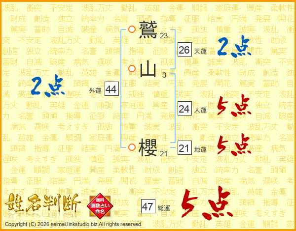 あなたの人生を表す1番重要な運勢です。生涯を通じて影響する総合運となり、主に50歳以降の晩年期に影響を及ぼします。苗字と名前の合計画数。