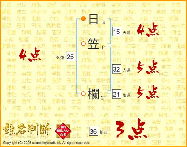 生活面を象徴する運勢です。外部から受ける影響力を表し、結婚運、家庭運や職場、環境への順応性を表します。総運から人運を引いた画数。姓や名が1文字の場合を除く。