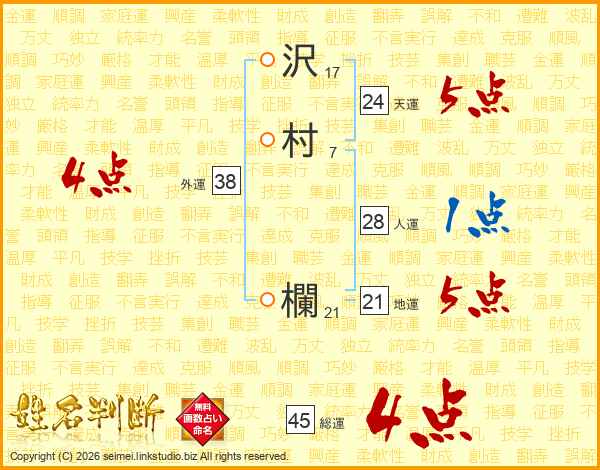 沢村欄さんの総運は45画の4点!
