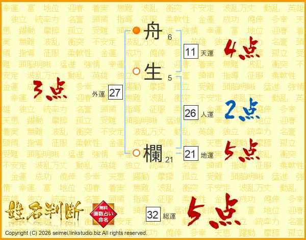 あなたの人生を表す1番重要な運勢です。生涯を通じて影響する総合運となり、主に50歳以降の晩年期に影響を及ぼします。苗字と名前の合計画数。