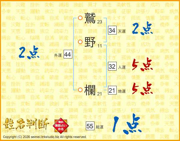 鷲野欄さんの総運は55画の1点!
