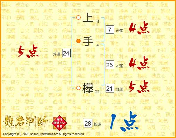 生活面を象徴する運勢です。外部から受ける影響力を表し、結婚運、家庭運や職場、環境への順応性を表します。総運から人運を引いた画数。姓や名が1文字の場合を除く。