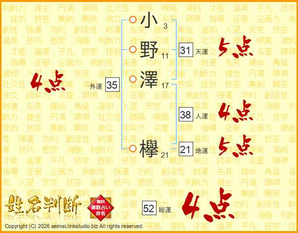 小野澤欅さんの総運は52画の4点!