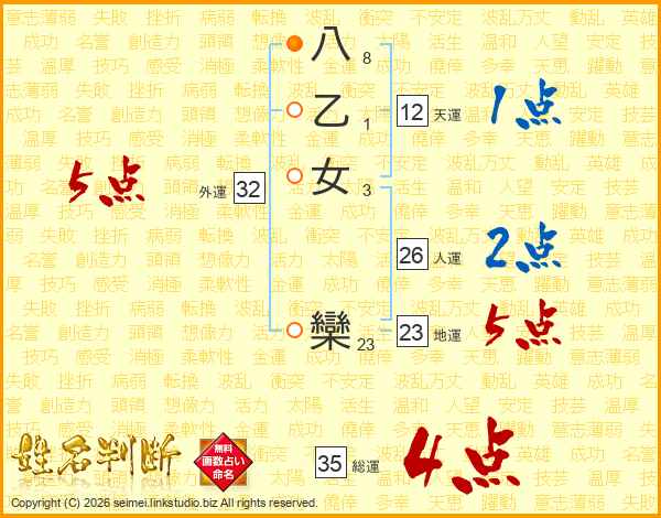 生活面を象徴する運勢です。外部から受ける影響力を表し、結婚運、家庭運や職場、環境への順応性を表します。総運から人運を引いた画数。姓や名が1文字の場合を除く。