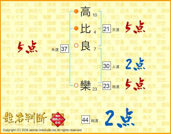 あなたの人生を表す1番重要な運勢です。生涯を通じて影響する総合運となり、主に50歳以降の晩年期に影響を及ぼします。苗字と名前の合計画数。