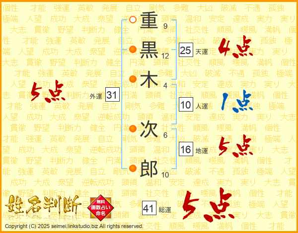 重(9画)黒(12画)木(4画) 次(6画)郎(10画)