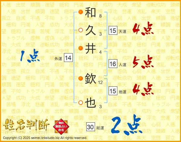 和(8画)久(3画)井(4画) 欽(12画)也(3画)