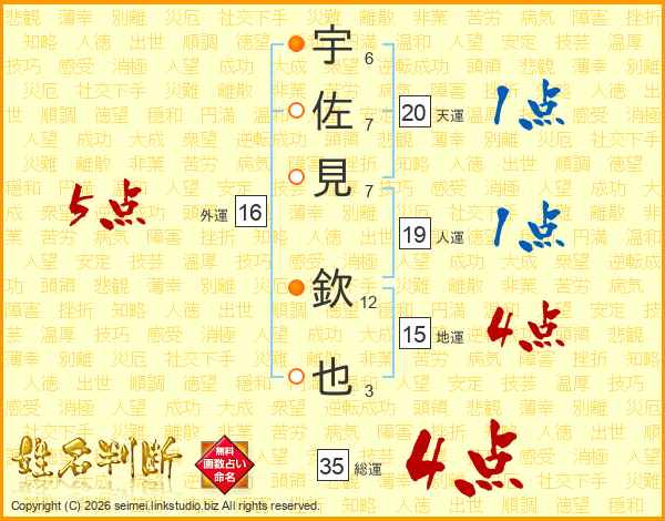 宇(6画)佐(7画)見(7画) 欽(12画)也(3画)