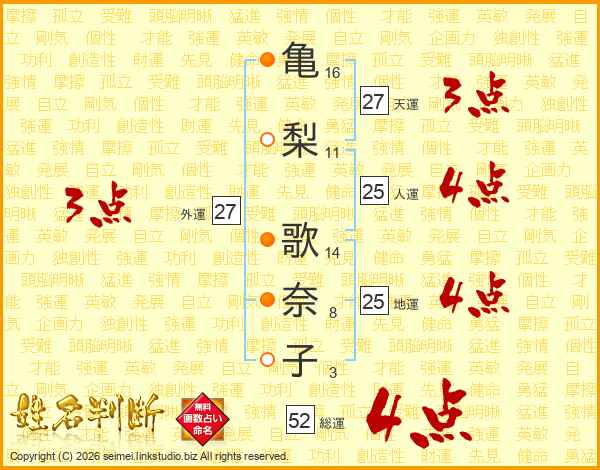 亀(16画)梨(11画) 歌(14画)奈(8画)子(3画)