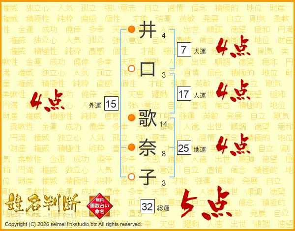 井(4画)口(3画) 歌(14画)奈(8画)子(3画)