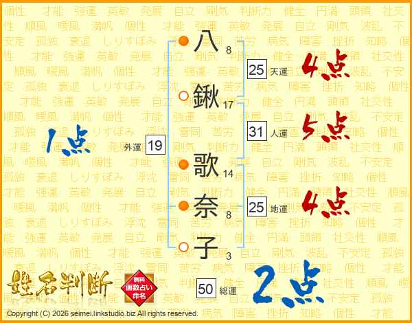 八(8画)鍬(17画) 歌(14画)奈(8画)子(3画)