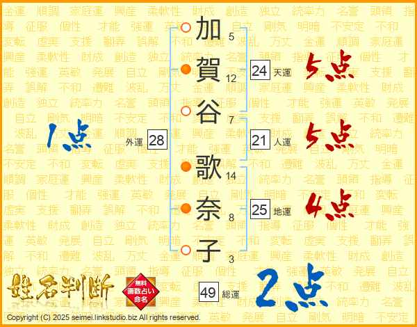 加(5画)賀(12画)谷(7画) 歌(14画)奈(8画)子(3画)