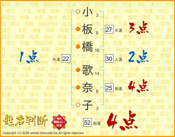 小(3画)板(8画)橋(16画) 歌(14画)奈(8画)子(3画)