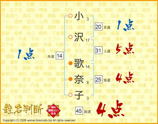 小沢歌奈子さんの総運は45画の4点!
